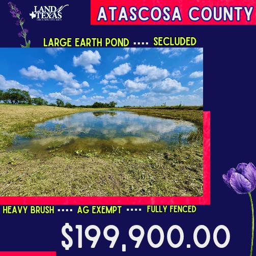 These fully fenced 25.00 acres have no restrictions and feature a large earth pond.The property is located only 11 miles from Jourdanton and 17 miles from Pleasanton, Texas.