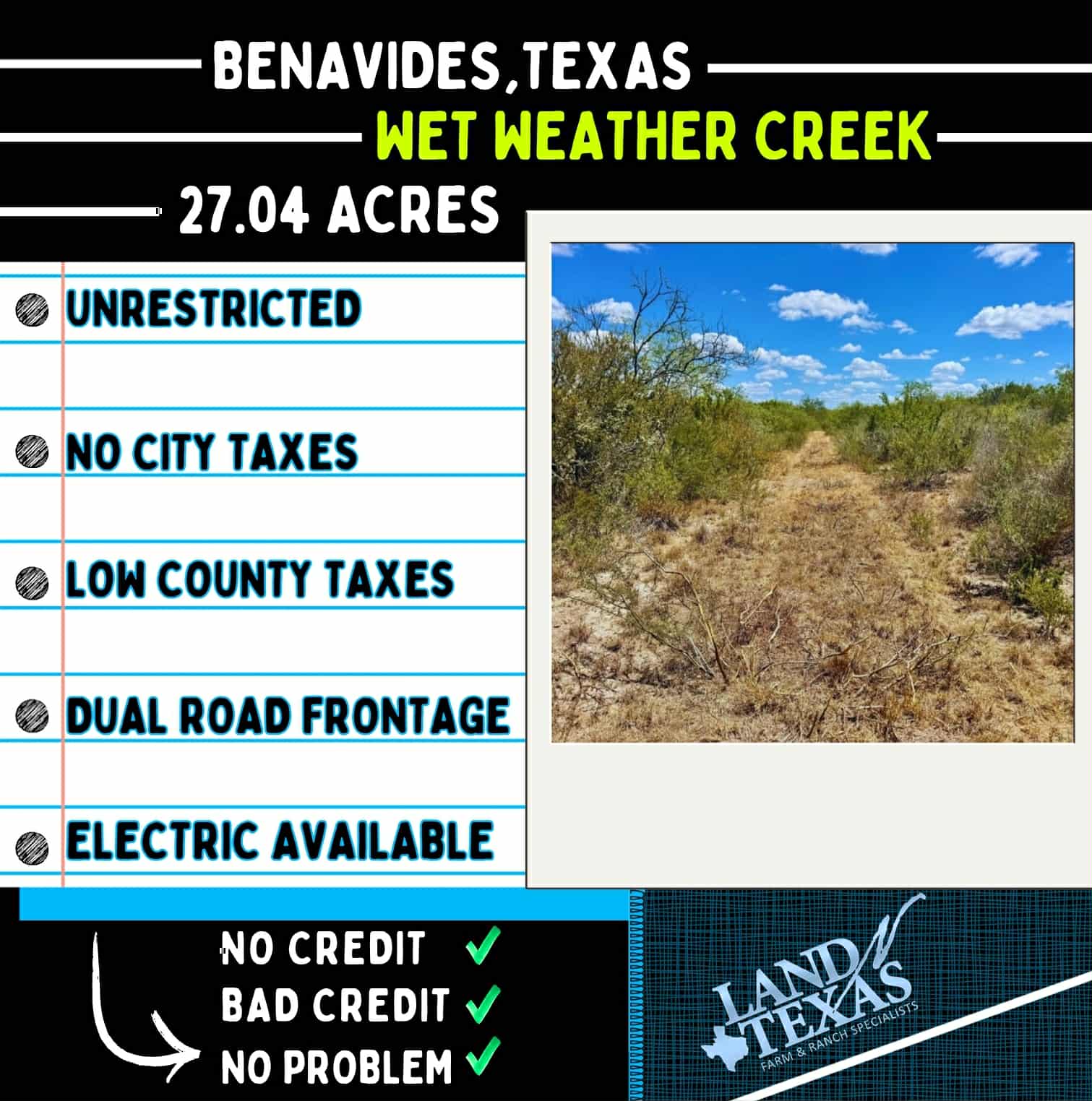 This 27.04 acre gem is conveniently located just a stone's throw away from Benavides, Texas (5.5 miles) in Duval County at the corner of Highway 359 and County Road 307, ensuring easy access.
